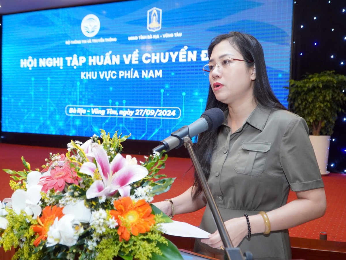 Phó Cục trưởng Cục Chuyển đổi số quốc gia Trần Thị Quốc Hiền phát biểu khai mạc hội nghị tập huấn chuyển đổi số khu vực phía Nam. Ảnh: Nguyễn Ngọc