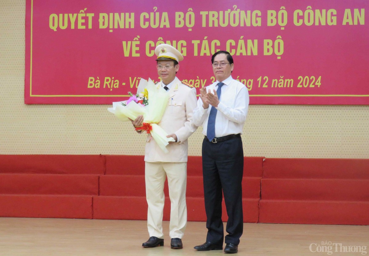 | Bí thư Tỉnh ủy Bà Rịa - Vũng Tàu Phạm Viết Thanh tặng hoa chúc mừng tân Giám đốc Công an tỉnh Bà Rịa - Vũng Tàu Vũ Như Hà. Ảnh: Nguyễn Ngọc |