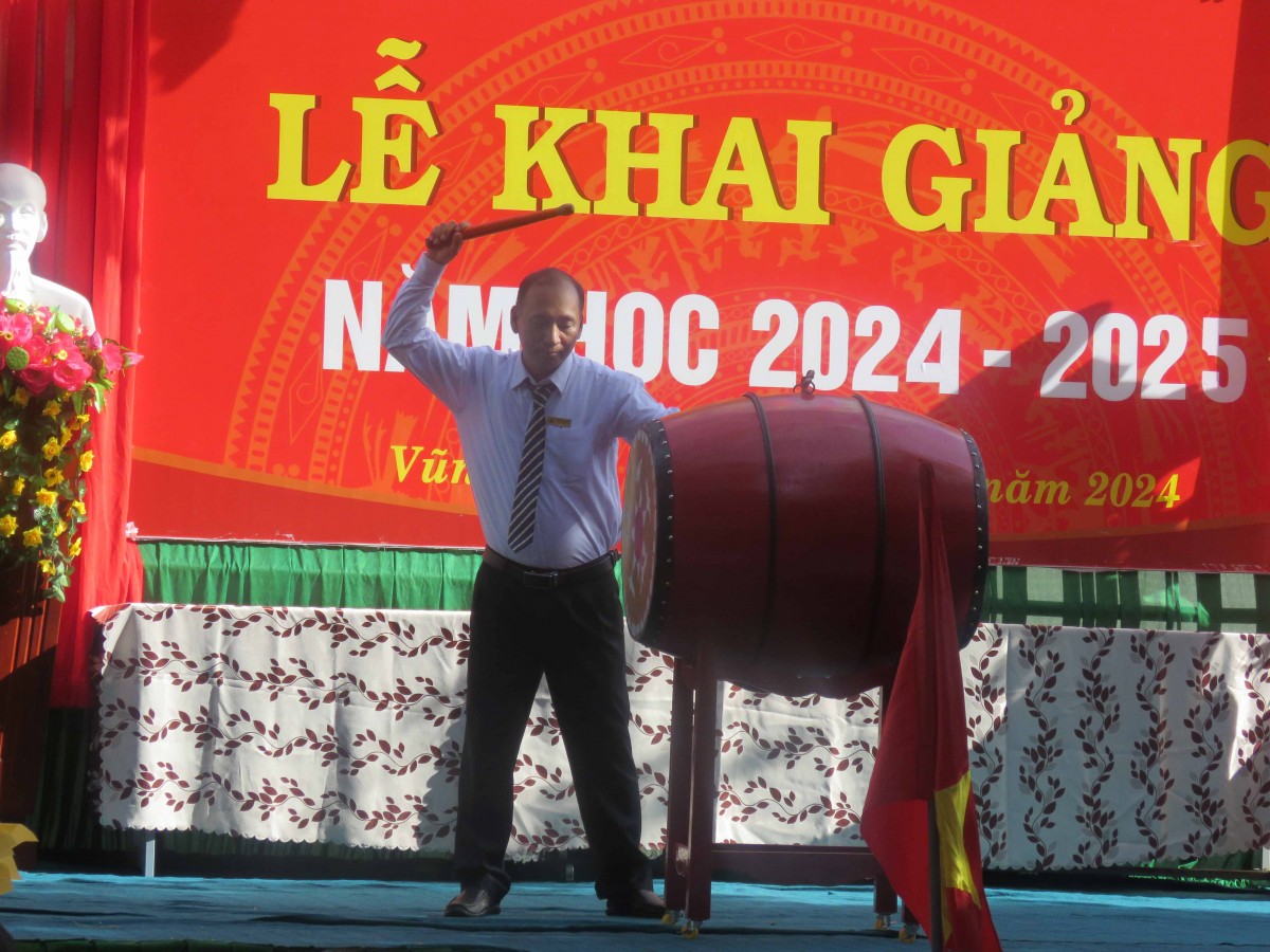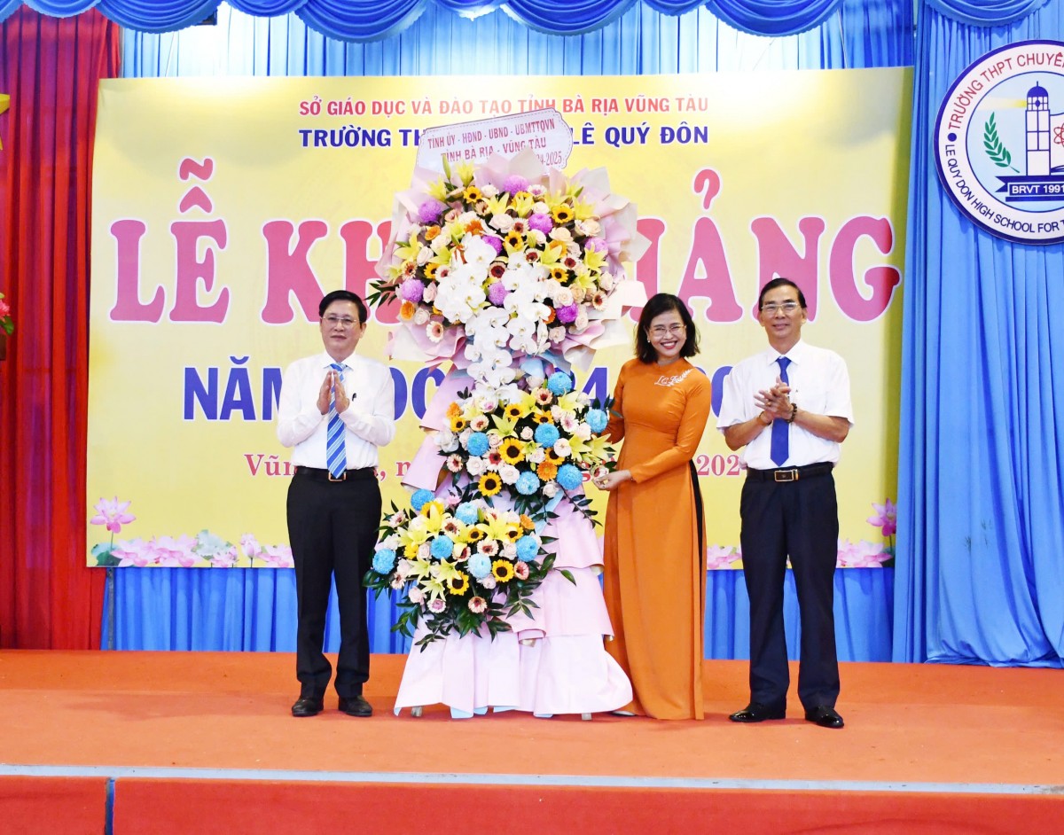 | Ông Lê Ngọc Khánh, Phó Chủ tịch UBND tỉnh Bà Rịa - Vũng Tàu tặng hoa chúc mừng lễ khai giảng năm học mới tại Trường THPT Chuyên Lê Quý Đôn. Ảnh: CTV |