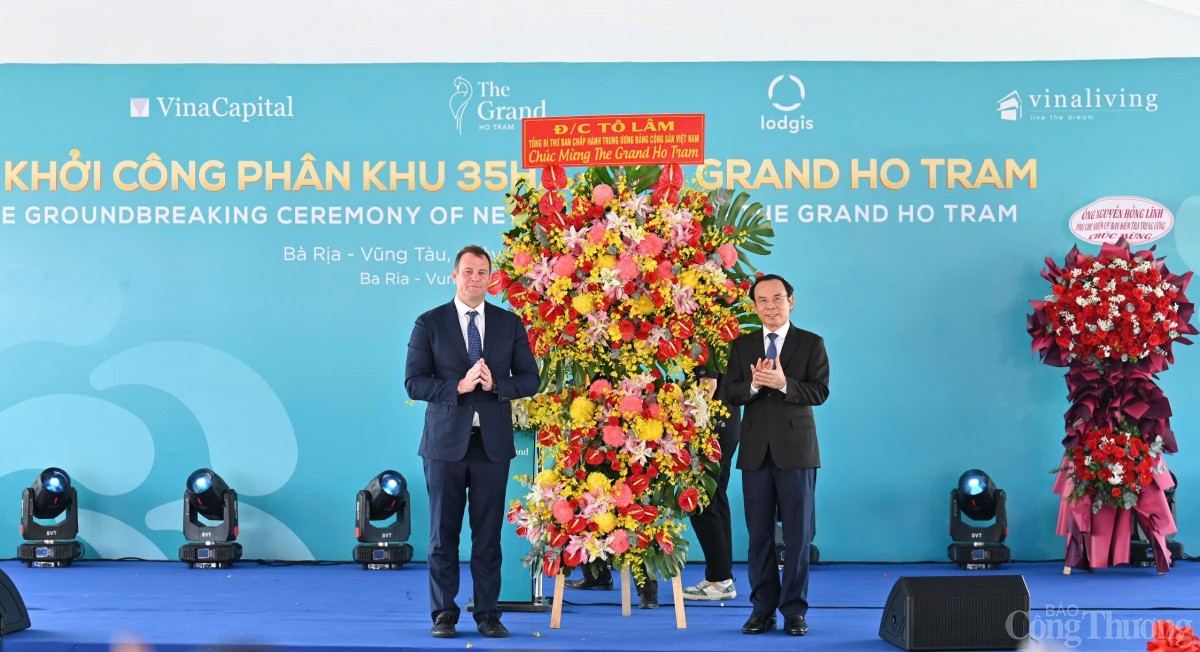 | Bí thư Thành ủy TP. Hồ Chí Minh Nguyễn Văn Nên thay mặt Tổng Bí thư Tô Lâm gửi tặng lẵng hoa tới lãnh đạo Công ty TNHH Dự án Hồ Tràm tại sự kiện. Ảnh: Nguyễn Ngọc |