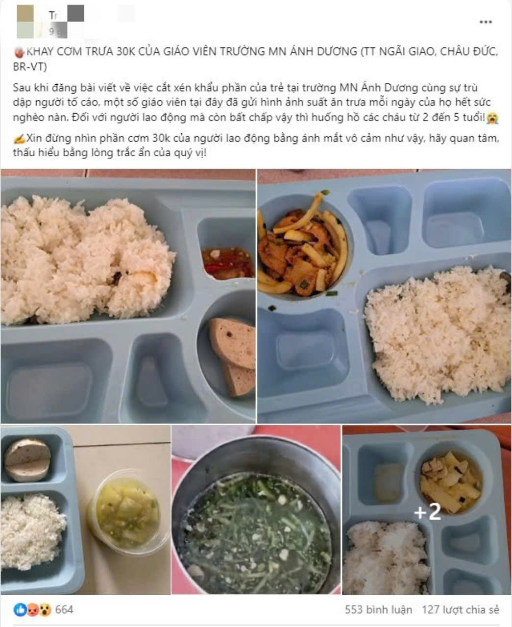 Theo đó, sáng cùng ngày, tài khoản mạng xã hội facebook T.X.T chia sẻ nội dung: “Sau khi đăng bài viết về việc cắt xén khẩu phần ăn của trẻ cùng sự trù dập người tố cáo, một số giáo viên tại Trường Mầm non Ánh Dương đã gửi hình ảnh suất ăn trưa của họ hết sức nghèo nàn. Đối với người lao động mà còn bất chấp vậy thì huống hồ các cháu từ 2 đến 5 tuổi. Xin đừng nhìn phần cơm 30.000 đồng của người lao động bằng ánh mắt vô cảm như vậy, hãy quan tâm, thấu hiểu bằng lòng trắc ẩn của quý vị!”.