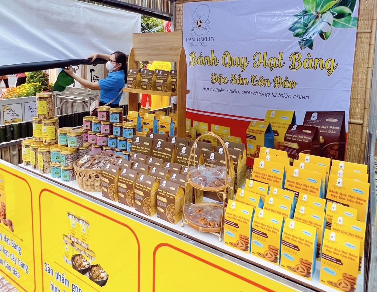 | Gian hàng trưng bày các sản phẩm làm từ hạt bàng Côn Đảo. Ảnh: Hani Bakery |