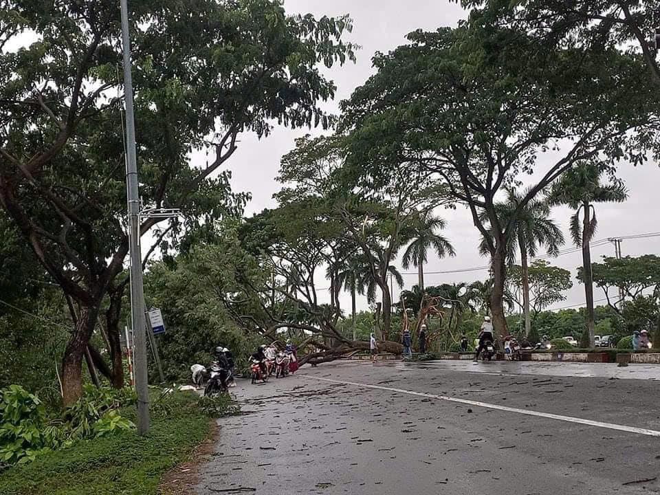 | Nhiều cây lớn bật gốc, đổ chắn ngang đường. Ảnh: Bạn đọc cung cấp |