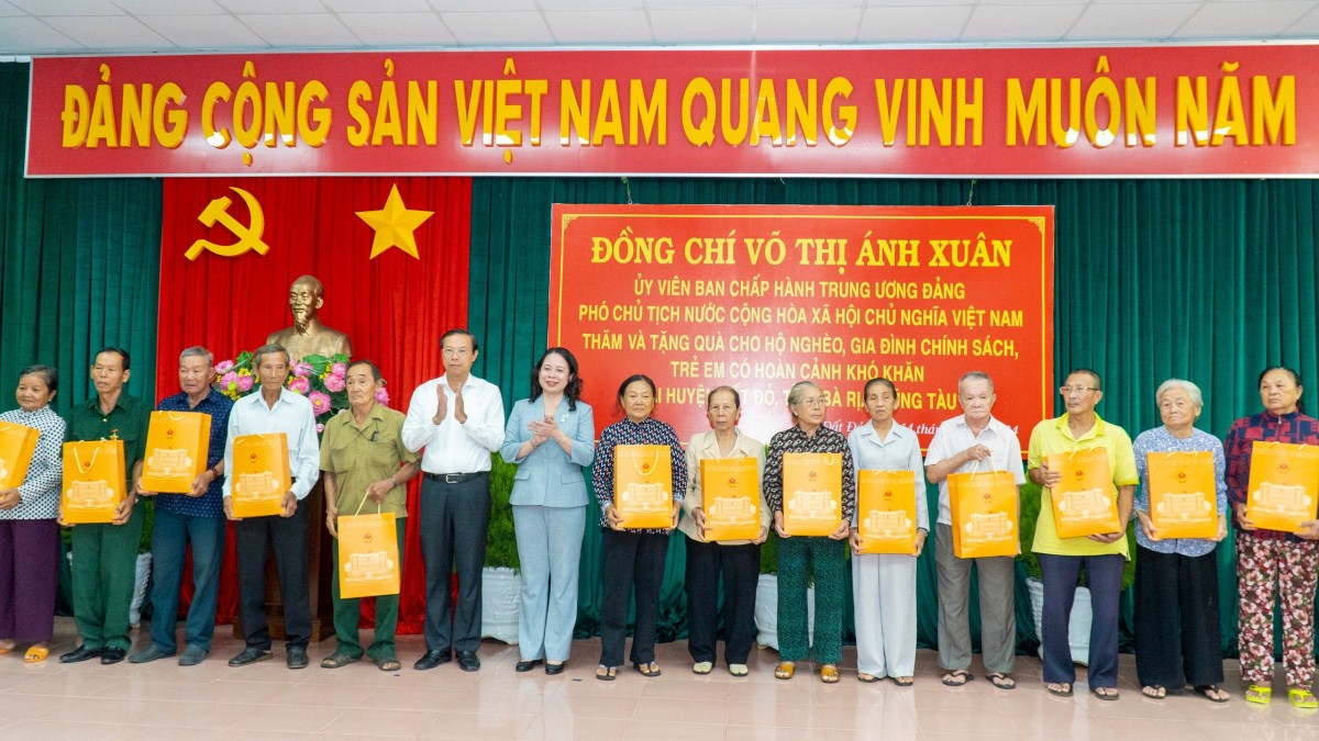 | Phó Chủ tịch nước Võ Thị Ánh Xuân và Chủ tịch UBND tỉnh Bà Rịa - Vũng Tàu Nguyễn Văn Thọ tặng quà cho người dân có hoàn cảnh khó khăn. Ảnh: Nguyễn Thắng |