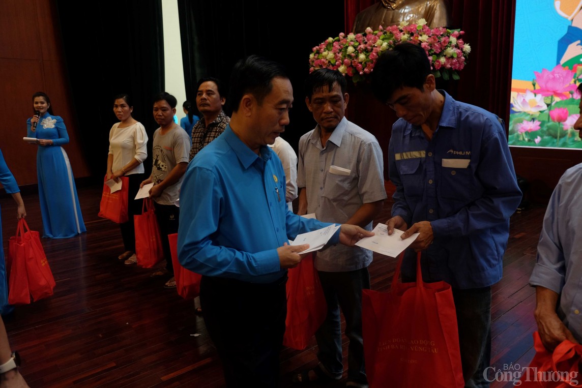 | Ông Lê Văn Hòa, Chủ tịch Liên đoàn Lao động tỉnh Bà Rịa – Vũng Tàu trao bằng khen cho các doanh nghiệp; trao quà cho công nhân, người lao động có hoàn cảnh khó khăn. |