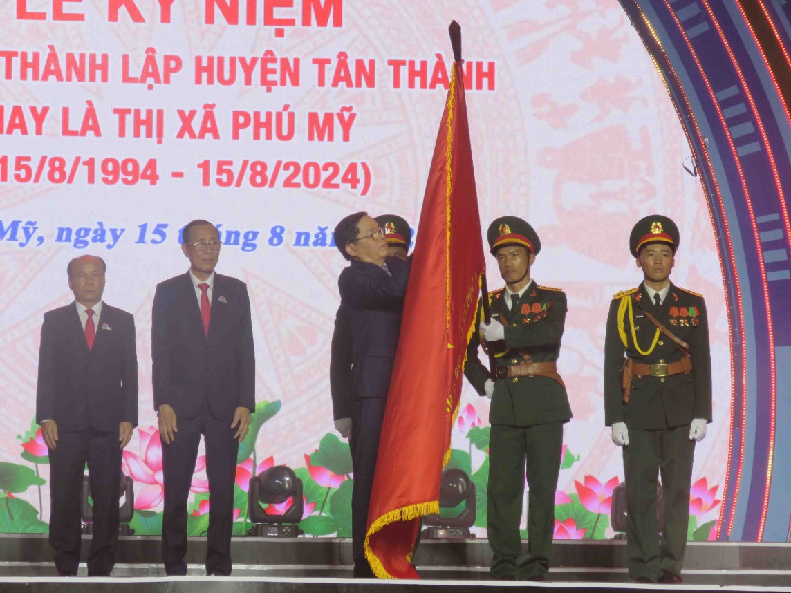 | Thị xã Phú Mỹ đón nhận Huân chương Lao động hạng Nhất. Ảnh: Nguyễn Ngọc |