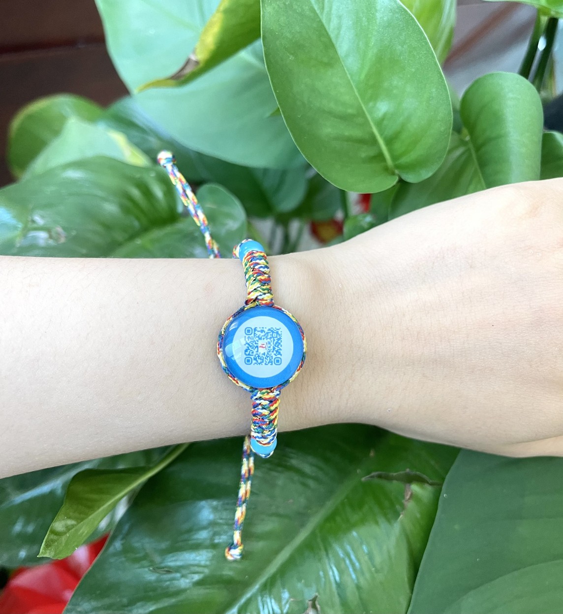 Chiếc vòng đeo tay handmade nhỏ gọn, phần dây thổ cẩm nhiều màu được đan kết xinh xắn và quan trọng hơn cả là mặt hình tròn tích hợp mã QR chứa các dữ liệu về du lịch trên chiếc vòng. Nhìn tổng thể tựa đồng hồ đeo tay trang sức, có tính thẩm mỹ cao và rất công nghệ nhờ tiện ích quét mã bằng điện thoại thông minh cung cấp những thông tin cần thiết.