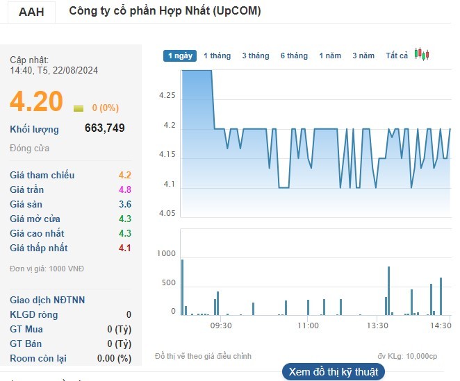 | Thông tin giao dịch của mã chứng khoán AAH thời điểm 14:45, T5, 22/08/2024 |