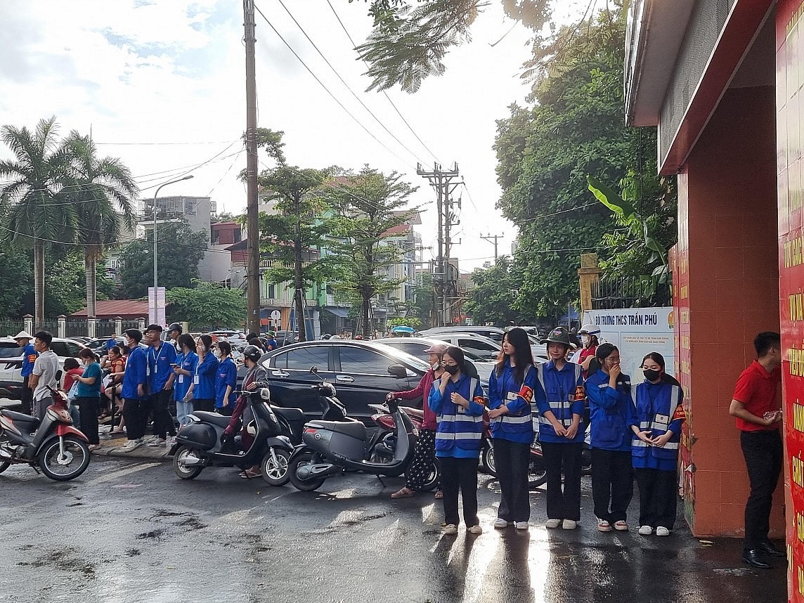 | Lực lượng đoàn viên hỗ trợ các thí sinh. (Ảnh: Chính Công) |