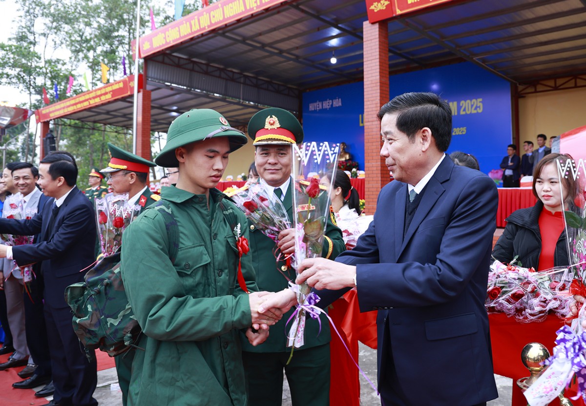 | Chủ tịch UBND tỉnh Bắc Giang Nguyễn Việt Oanh tặng hoa, động viên các tân binh huyện Tân Yên lên đường nhập ngũ, phấn đấu hoàn thành tốt nhiệm vụ. Ảnh: Nguyễn Miền |