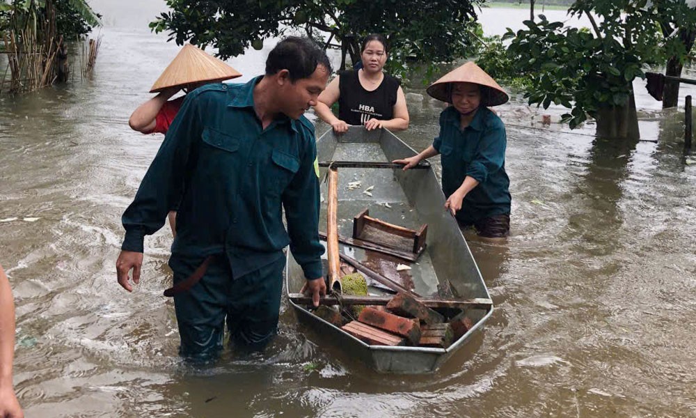 | Lực lượng chức năng giúp người dân xã Canh Nậu (Yên Thế) dọn nhà cửa chạy lũ. Nguồn ảnh: Báo Bắc Giang |