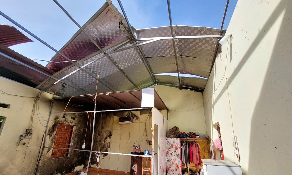 | Vụ nổ lớn khiến một phần mái tôn bị thổi bay để lại khung sắt. Ảnh: Thu Hương |