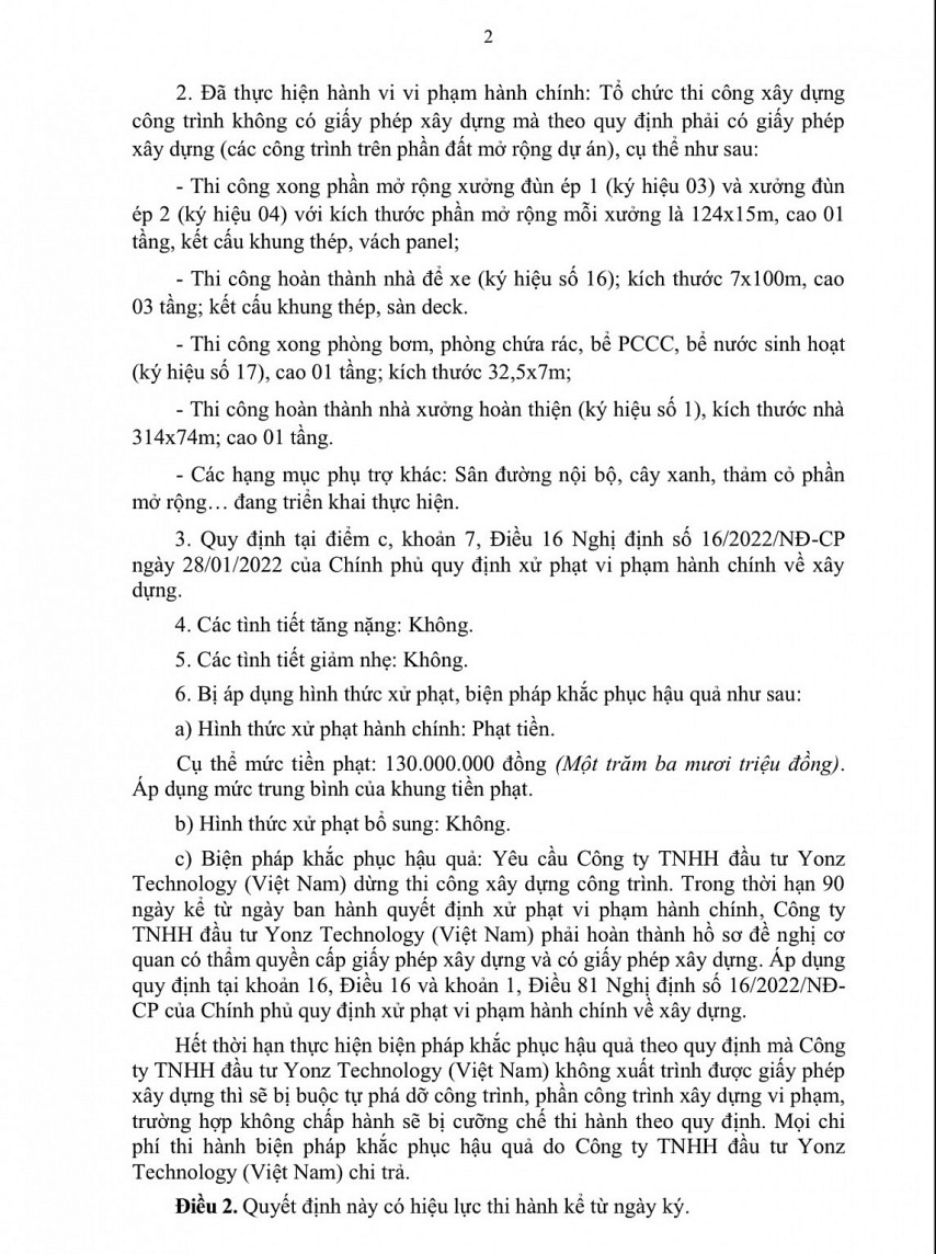 Công ty TNHH Đầu tư Yonz Technology (Việt Nam) đã thực hiện hành vi vi phạm hành chính khi tổ chức thi công xây dựng công trình không có giấy phép xây dựng mà theo quy định phải có giấy phép xây dựng.
