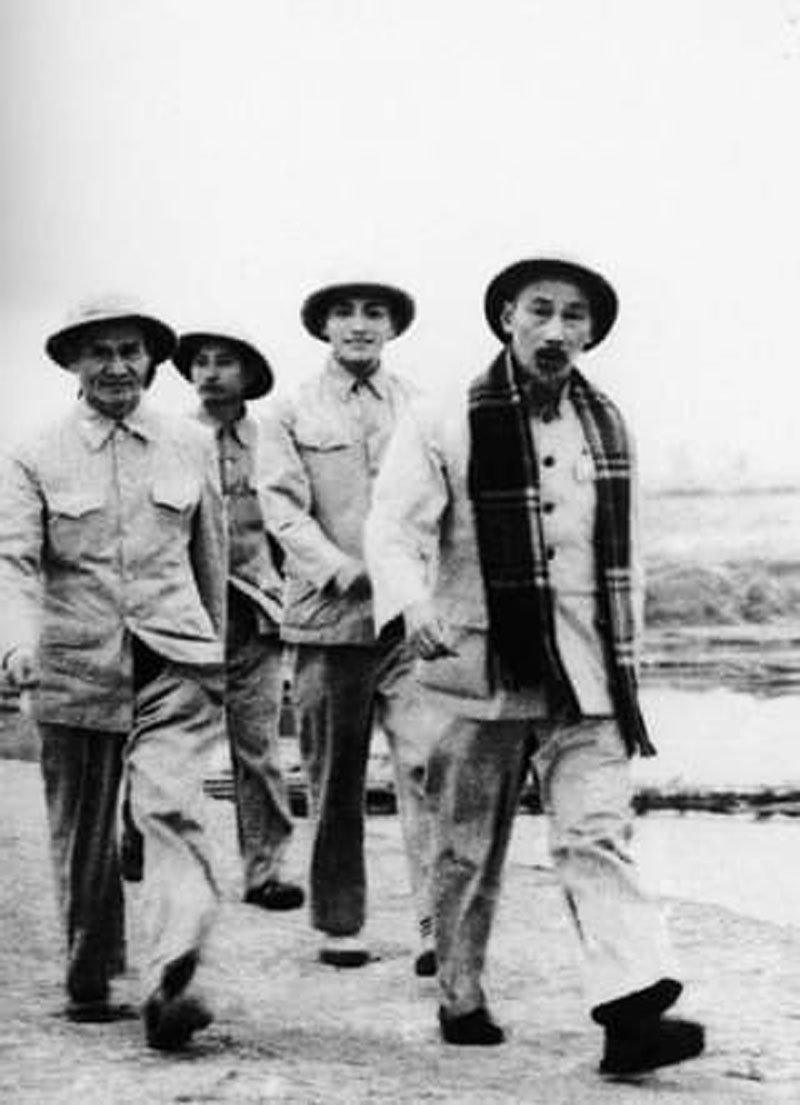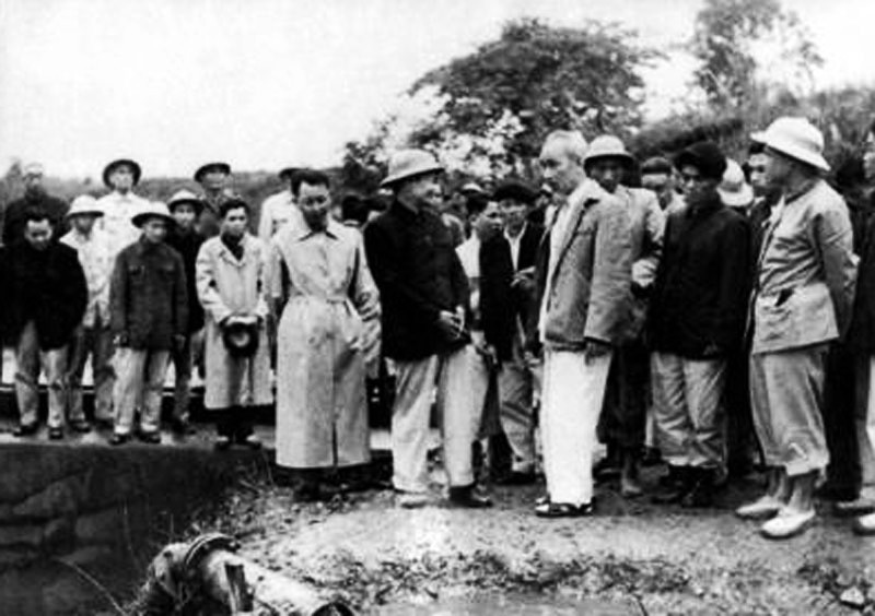 | Bác Hồ đi thăm công trường đập Thác Huống, ngày 25/1/1955. (Ảnh tư liệu) |