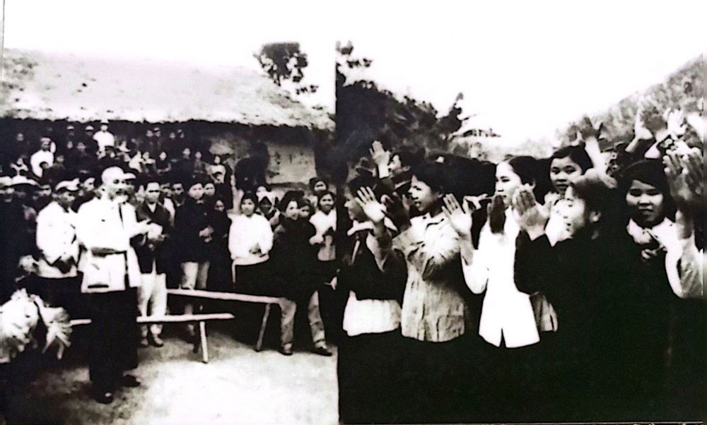 | Chủ tịch Hồ Chí Minh thăm đồng bào Hùng Sơn, xã Phục Linh, huyện Đại Từ, tỉnh Thái Nguyên năm 1954. (Ảnh tư liệu) |