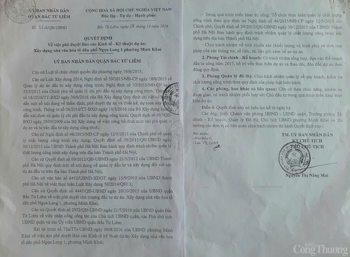 | Ngày 28/10/2016, bà Nguyễn Thị Nắng Mai - Phó Chủ tịch UBND quận Bắc Từ Liêm vẫn ký ban hành Quyết định 5216/QĐ-UBND về việc phê duyệt Báo cáo Kinh tế - Kỹ thuật với tổng vốn đầu tư 3 tỷ đồng, dù chưa giải quyết xong khiếu kiện của người dân. |