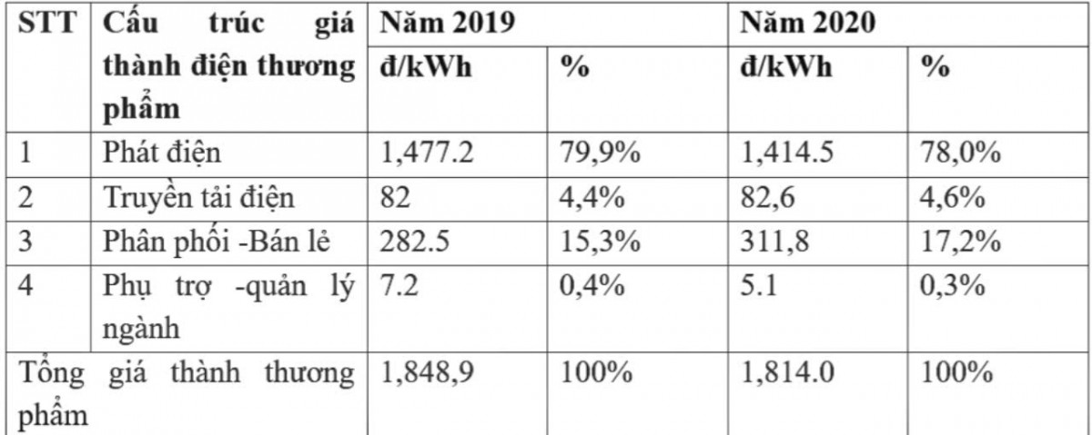 | Cấu trúc chi phí giá thành theo sản lượng điện thương phẩm giai đoạn 2019-2020 (Theo Ban TCKT EVN) |