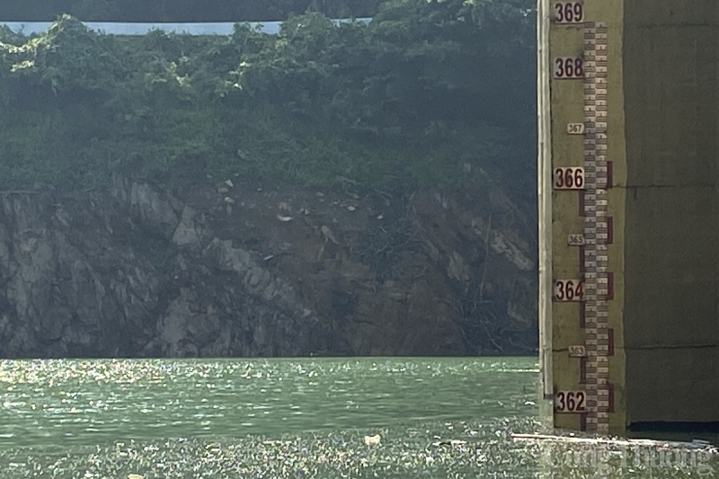 | Mực nước tại hồ thủy điện A Vương ngày 20/5 thấp hơn nhiều mực nước dâng bình thường (380m) |