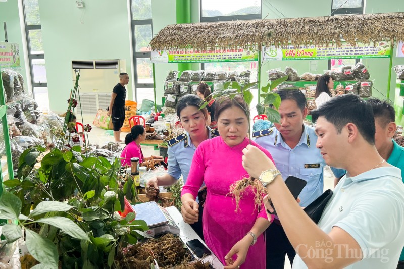 | Lực lượng quản lý thị trường Quảng Nam túc trực tại phiên chợ sâm để giám sát đảm bảo các sản phẩm từ sâm Ngọc Linh bày bán trong phiên chợ |