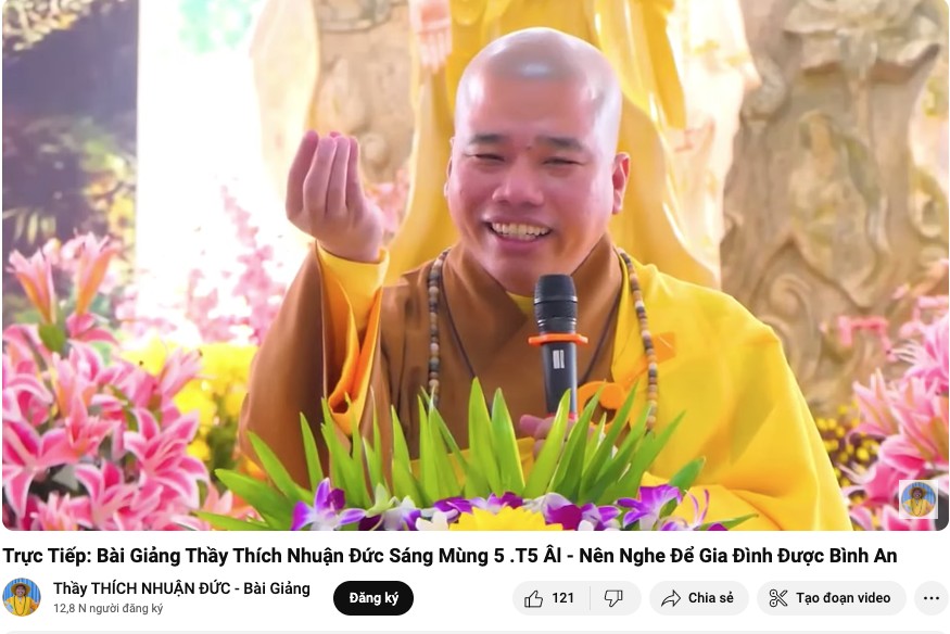 | Đại đức Thích Nhuận Đức bị cấm thuyết giảng vô thời hạn, dưới mọi hình thức vì những lời, thái độ khiếm nhã (Trong ảnh là trạng thái "phát trực tiếp" trên nền tảng YouTube diễn ra sáng 10/6/2024 của kênh Thầy Thích Nhuận Đức) |