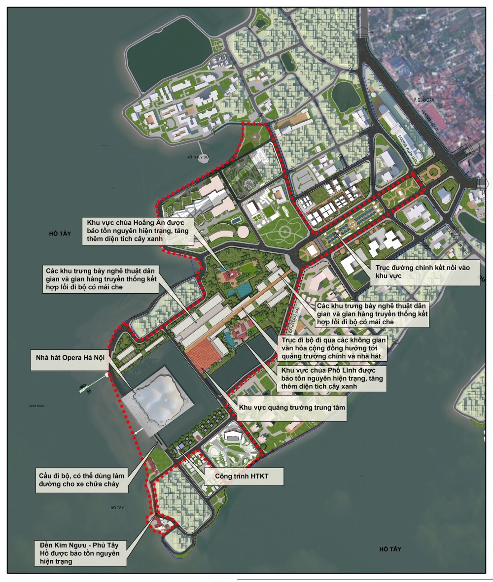 Ý tưởng chính của thiết kế tổng mặt bằng là tận dụng tối đa các lợi thế về văn hóa, lịch sử và điều kiện tự nhiên mặt nước, cây xanh của khu đất, tạo nên một lá phổi xanh, sạch, đẹp và hiện đại cho thủ đô. Với mục tiêu phát triển khu vực Hồ Tây mang tầm quốc tế, khu vực Quảng An được quy hoạch để xây dựng mới trung tâm văn hóa dọc bờ Bắc và bờ Nam sông Hồng, gắn với trục kết nối không gian thành cổ Hà Nội và trục Tây Hồ Tây - Hồ Tây - Cổ Loa. Đồ án cũng đã có những đề xuất hết sức rõ ràng về kết nối không gian đô thị, hạ tầng giao thông, bãi đỗ xe… Từ đó cải thiện hệ thống hạ tầng kỹ thuật, giao thông, bổ sung bãi đỗ xe, bảo vệ môi trường sinh thái mặt nước Hồ Tây và môi trường khu vực.