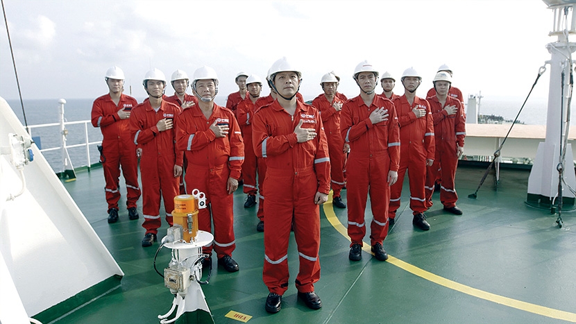| Người lao động PVTrans thực hiện nghi thức chào cờ trên tàu |