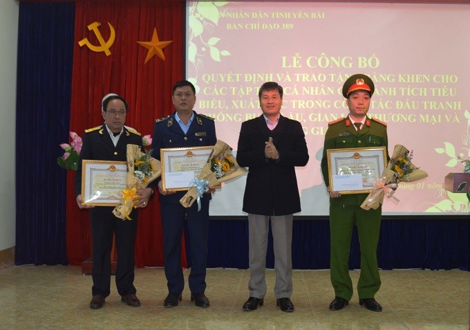 | Đại diện các lực lượng thuộc Ban Chỉ đạo 398 tỉnh Yên Bái nhận Bằng khen của Ban Chỉ đạo 389 Quốc gia vì có thành tích xuất sắc trong công tác đấu tranh phòng, chống buôn lậu, gian lận thương mại và hàng giả |