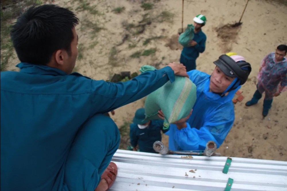 | Lực lượng dân quân, bộ đội tích cực hỗ trợ người dân chằng chống nhà cửa |