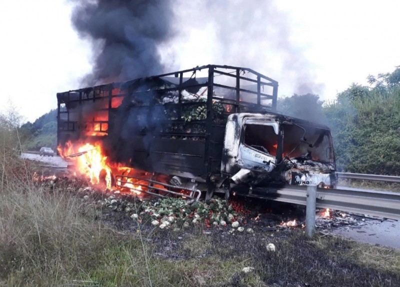 | Chiếc xe tải bốc cháy ngùn ngụt trên cao tốc (Ảnh: CACC) |