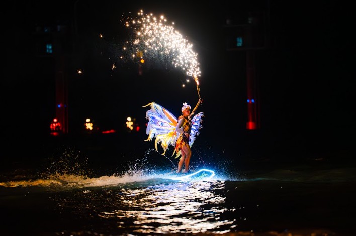 Toàn bộ show diễn được dàn dựng và biểu diễn trực tiếp trên mặt biển rộng hơn 50.000m², lấy cảm hứng từ truyền thuyết nàng tiên hạc Cát Bà và thuyết ngũ hành trong văn hóa phương Đông. Các vận động viên quốc tế đến từ khắp nơi trên thế giới phối hợp đồng bộ trong đội hình jetski, flyboard và jetsurf – những bộ môn thể thao mạo hiểm vốn đã thách thức ở điều kiện tiêu chuẩn, nay được lập trình theo hệ thống âm nhạc, ánh sáng, pháo hoa và laser khớp tới từng giây.