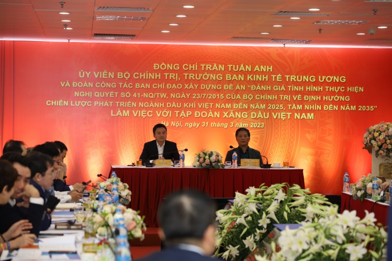 Đoàn công tác của Ban Chỉ đạo xây dựng Đề án “Đánh giá tình hình triển khai thực hiện Nghị quyết 41-NQ/TW, ngày 23/7/2015 của Bộ Chính trị về định hướng chiến lược phát triển ngành Dầu khí Việt Nam đến năm 2025, tầm nhìn đến năm 2035” đã có buổi làm việc với Tập đoàn Xăng dầu Việt Nam (Petrolimex) ngày 30/03, tại Hà Nội. Ông Trần Tuấn Anh, Ủy viên Bộ Chính trị, Trưởng Ban Kinh tế Trung ương, Trưởng Ban Chỉ đạo xây dựng Đề án chủ trì buổi làm việc.
