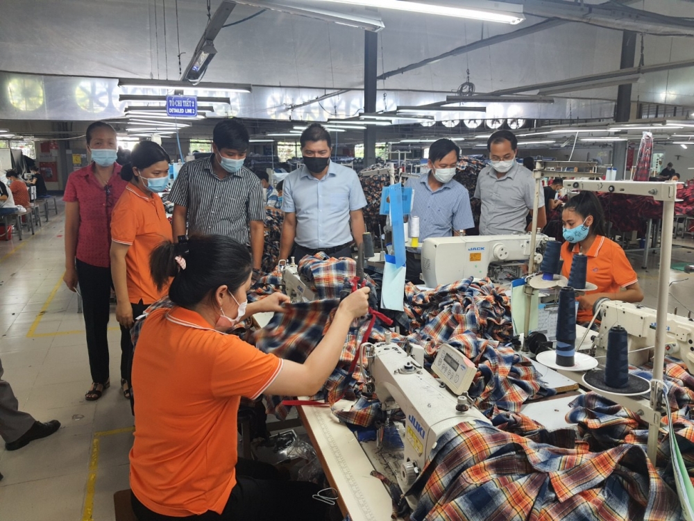 | Đại diện Ban quản lý Khu kinh tế Quảng Bình cùng Sở Công Thương Quảng Bình kiểm tra công tác sản xuất trong thời gian dịch Covid-19 diễn biến phức tạp tại các nhà máy. |