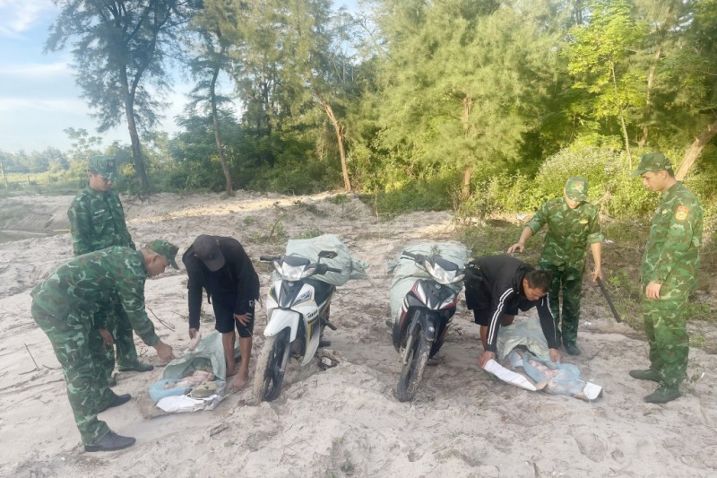 Cụ thể, vào hồi 16 giờ, ngày 18/9/2023, tại bãi biển khu vực Cồn Mang thuộc khu Tràng Vỹ, phường Trà Cổ, TP Móng Cái, Đội tuần tra kiểm soát (TTKS), Đồn Biên phòng Trà Cổ trong quá trình thực hiện nhiệm vụ phát hiện 2 người điều khiển xe máy chở các bao tải dứa màu xanh, thấy có biểu hiện nghi vấn nên đã yêu cầu dừng lại và tiến hành kiểm tra.