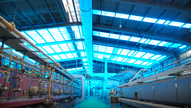 Hệ thống nhà xưởng đã lắp tấm chiếu sáng để tận dụng ánh sáng tự nhiên thay việc sử dụng nhiều bóng đèn giúp tiết kiệm điện năng.