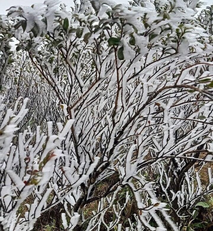 | Băng tuyết bao bọc trắng cành cây đỗ quyên ở điểm 2.300m, trên đường lên đỉnh Fansipan Ảnh: VTC |
