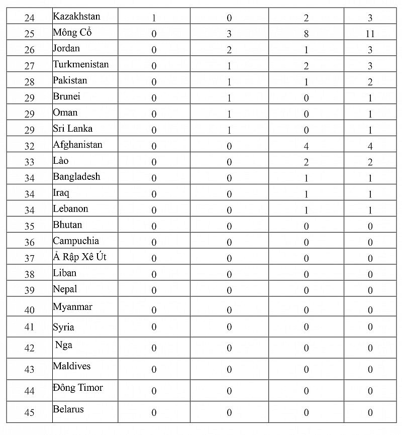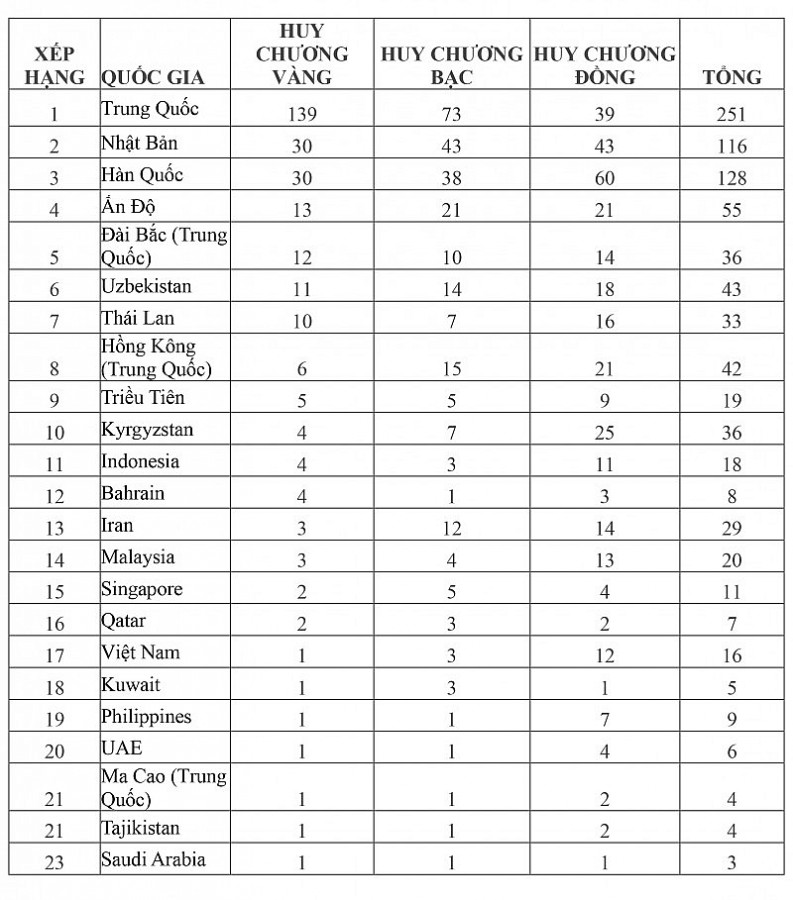 BẢNG TỔNG SẮP HUY CHƯƠNG ASIAD 19 – NGÀY 2/10: