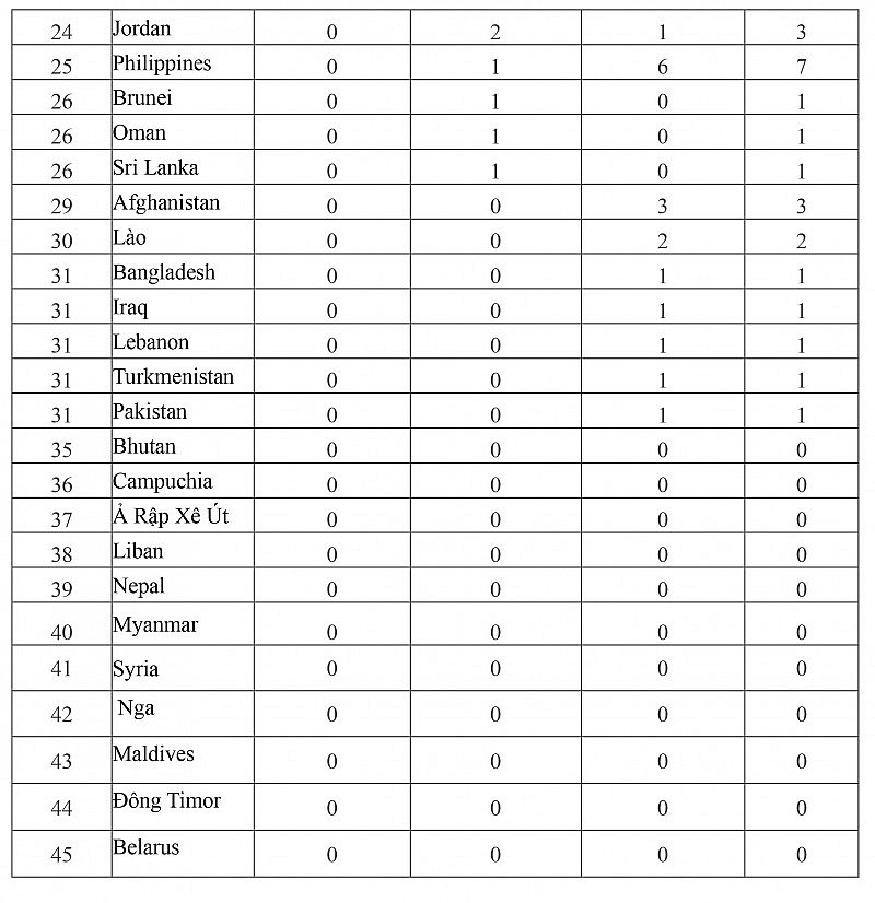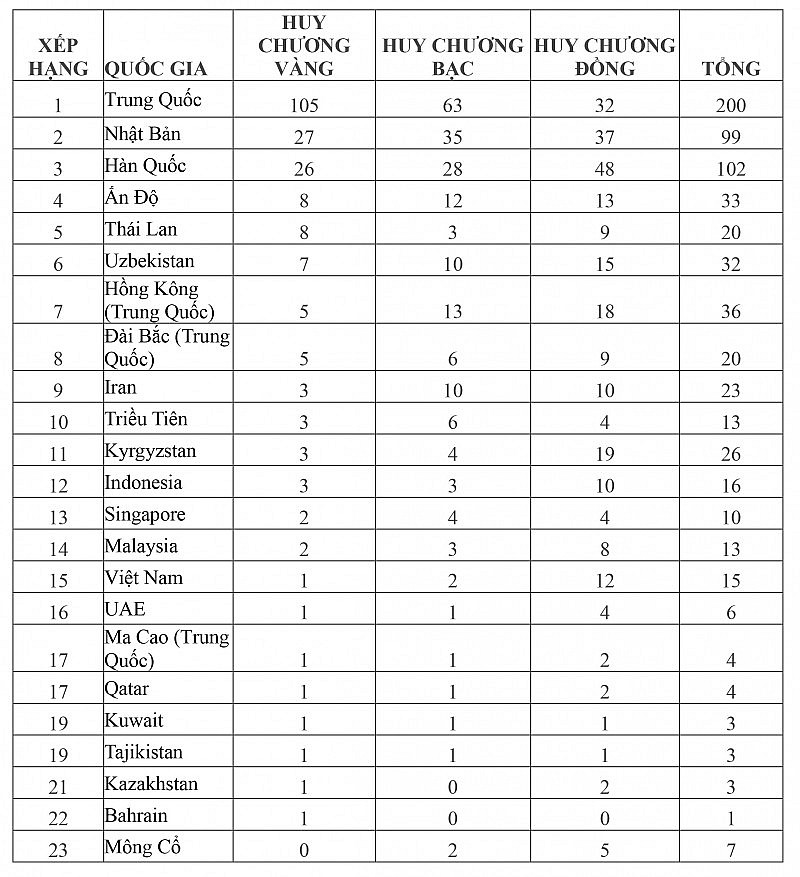 BẢNG TỔNG SẮP HUY CHƯƠNG ASIAD 19 – NGÀY 30/9: