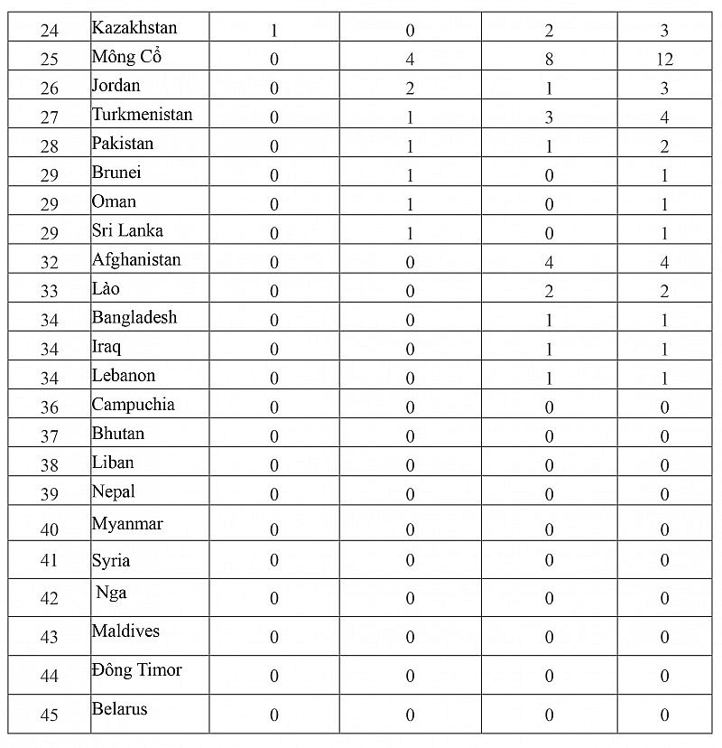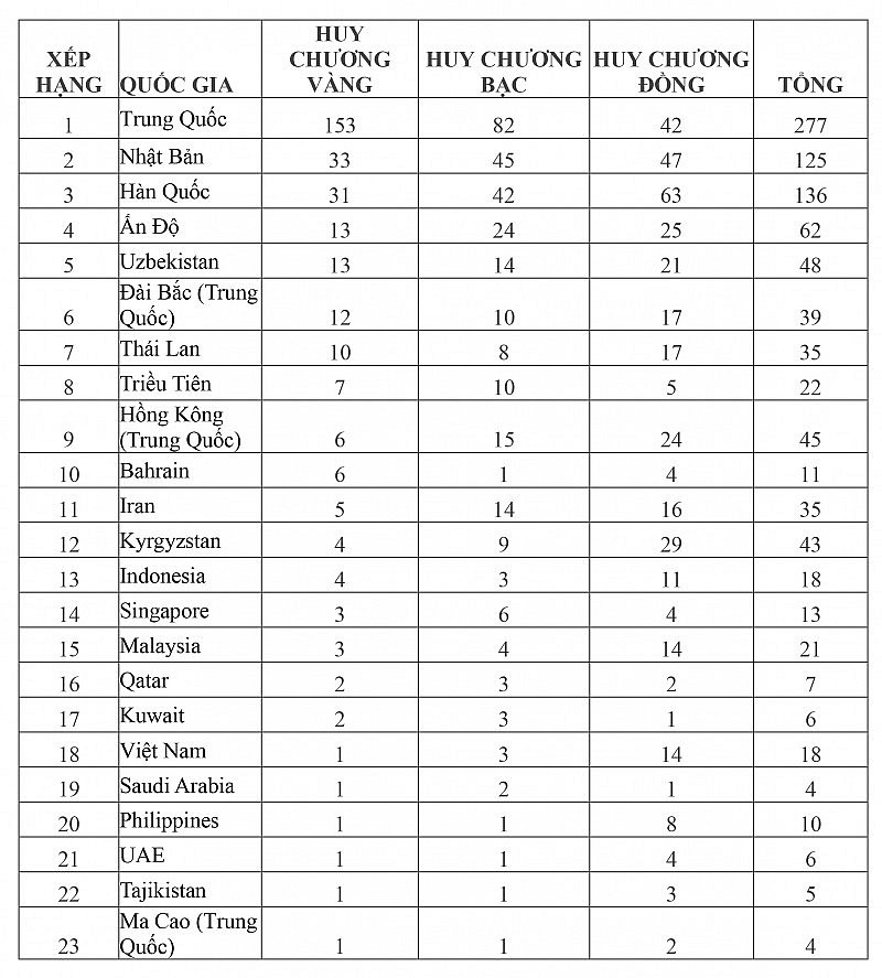 BẢNG TỔNG SẮP HUY CHƯƠNG ASIAD 19 – NGÀY 3/10: