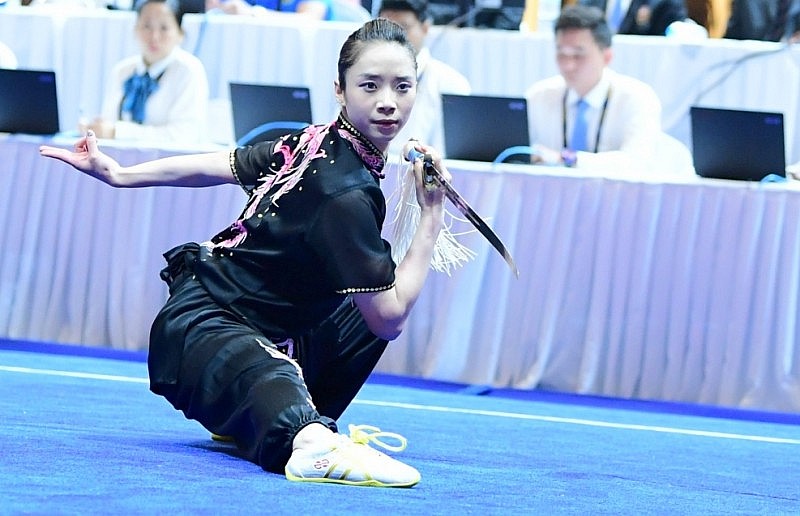 | Dương Thúy Vi trong phần thi giành huy chương vàng nội dung thương thuật + kiếm thuật môn Wushu đầu tiên cho đoàn Việt Nam trong ngày 11/5 (Ảnh: Dương Thuật) |