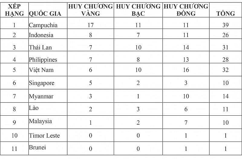 BẢNG TỔNG SẮP HUY CHƯƠNG SEA GAMES 32 – NGÀY 7/5: