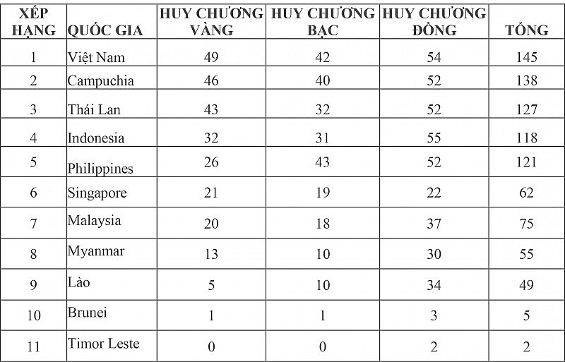 BẢNG TỔNG SẮP HUY CHƯƠNG SEA GAMES 32 – NGÀY 10/5: