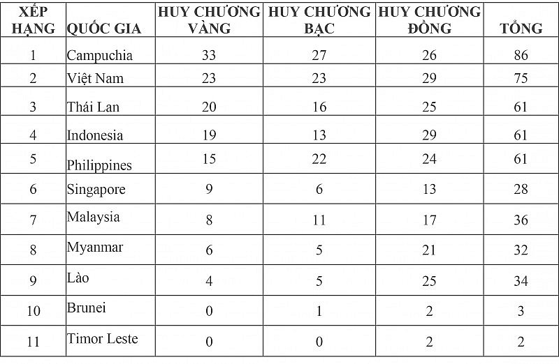 BẢNG TỔNG SẮP HUY CHƯƠNG SEA GAMES 32 – NGÀY 8/5: