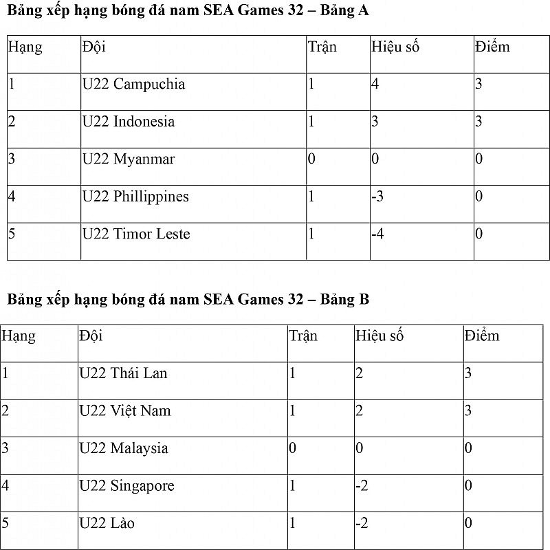 Sau đó, vào lúc 19 giờ tối ngày 30/4, cũng tại bảng B môn bóng đá nam SEA Games 32, U22 Việt Nam giành thắng lợi trước U22 Lào tỷ số 2-0. Với kết quả này, U22 Việt Nam có 3 điểm đứng vị trí thứ 2 trên bảng xếp hạng, do thua U22 Thái Lan về chỉ số phụ.