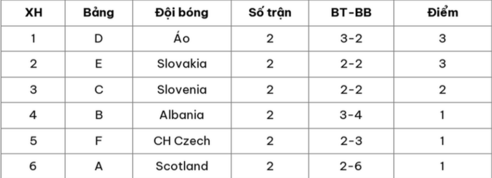| Bảng xếp hạng các đội thứ ba vòng bảng EURO 2024 |