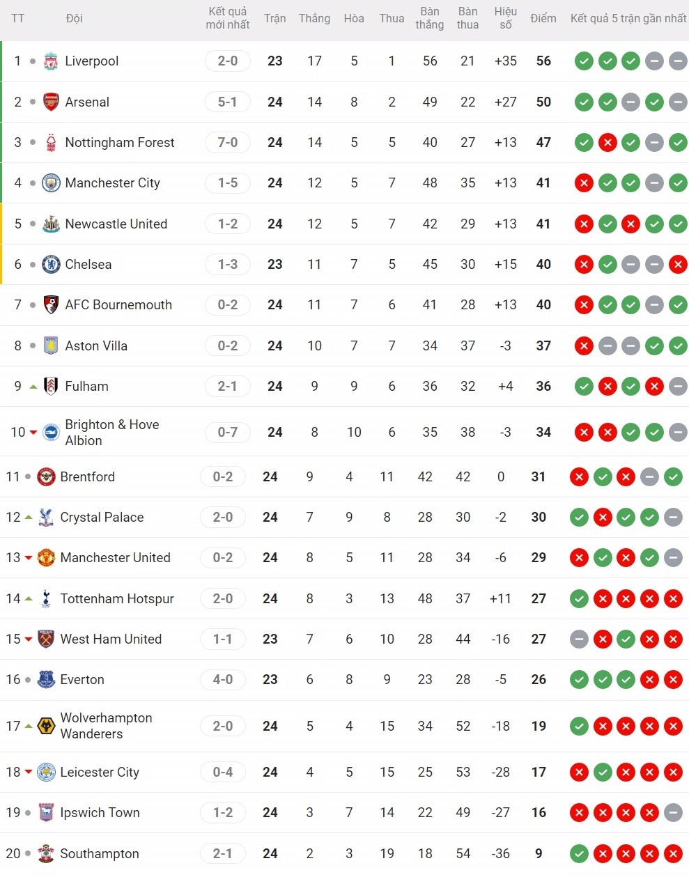 Đêm 2/2/2025, vòng 24 Ngoại hạng Anh đã diễn ra nhiều cặp đấu hấp dẫn. Sau khi các trận đấu kết thúc, bảng xếp hạng Ngoại hạng Anh đã có sự thay đổi đáng kể.