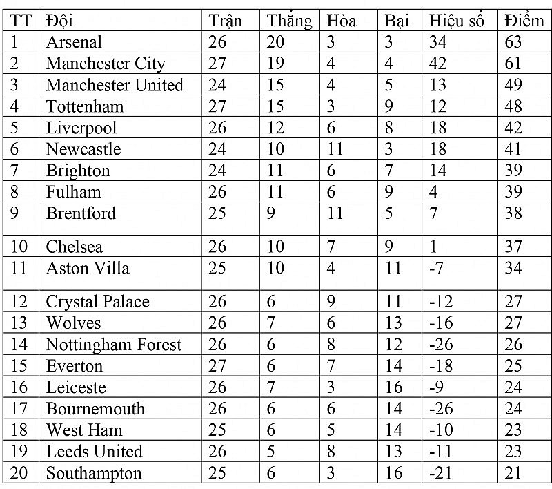 Bảng xếp hạng ngoại hạng Anh hôm nay: