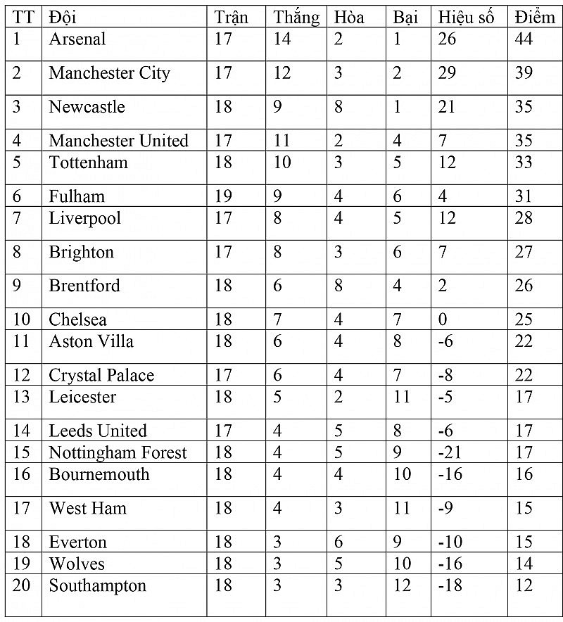 Bảng xếp hạng ngoại hạng Anh hôm nay: