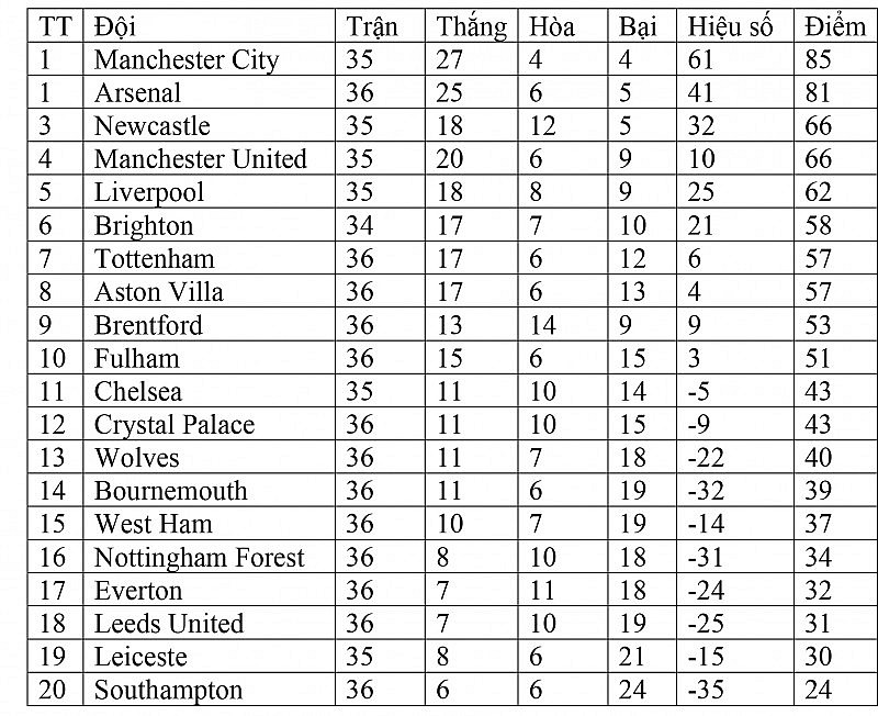 | Bảng xếp hạng Ngoại hạng Anh hôm nay ngày 8/5: Arsenal bám sát Man CityBảng xếp hạng Ngoại hạng Anh hôm nay ngày 14/5: Man United nới rộng cách biệt với Liverpool |
