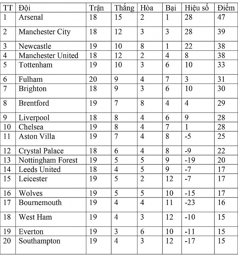 Bảng xếp hạng Giải bóng đá Ngoại hạng Anh 2022-2023. Cập nhật liên tục bảng xếp hạng bóng đá Ngoại hạng Anh mùa giải 2022-2023 mới và chính xác nhất.