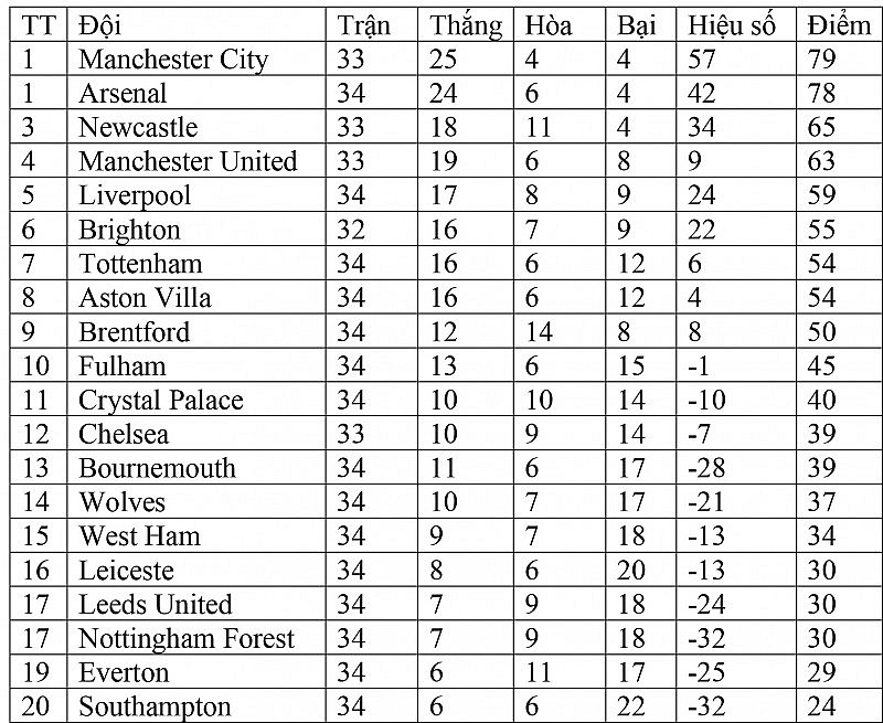 Bảng xếp hạng ngoại hạng Anh hôm nay:
